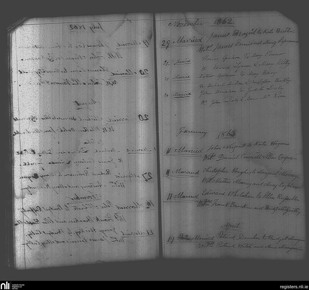 Castlejordan; County of Meath, Offaly; Diocese of Meath. Marriages, Nov. 1862 to Apr. 1863