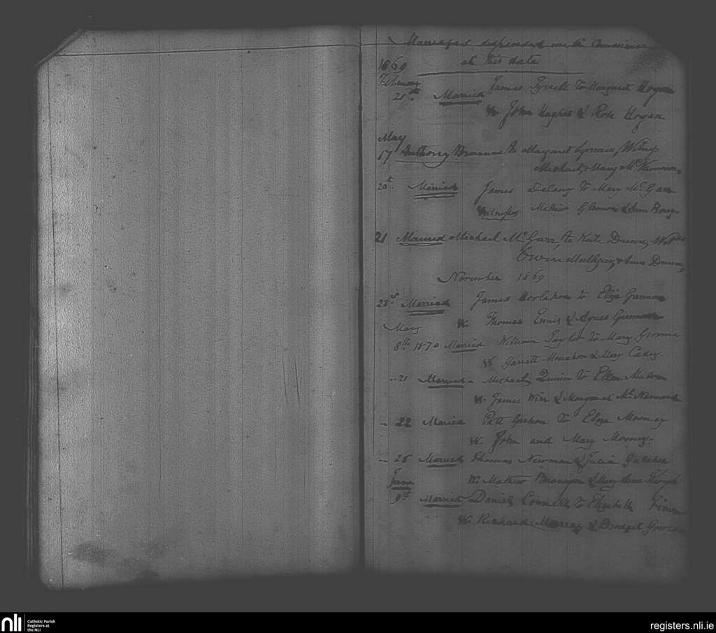 Castlejordan; County of Meath, Offaly; Diocese of Meath. Marriages, Feb. 1869 to June 1870