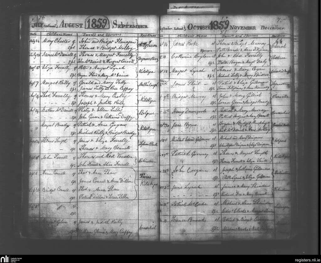 Kilskyre; County of Meath; Diocese of Meath. Baptisms, July 1859 to Dec. 1859