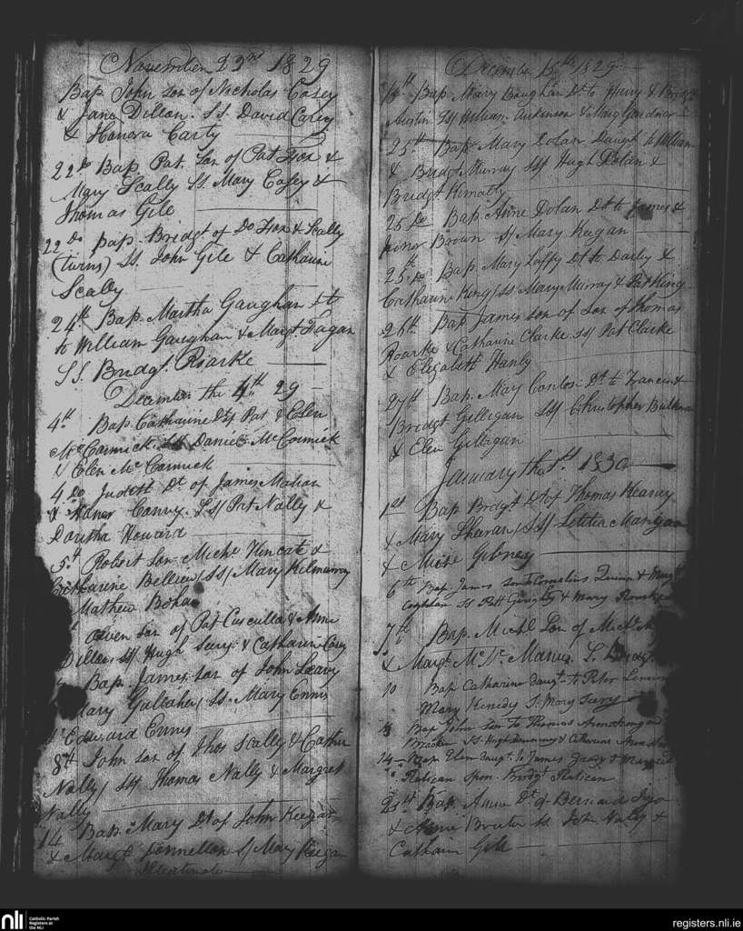 Ballymore; County of Westmeath; Diocese of Meath. Baptisms, Nov. 1829 to Jan. 1830
