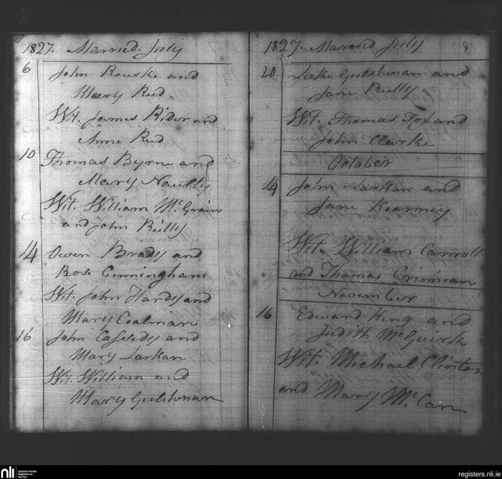 Beauparc; County of Meath; Diocese of Meath. Marriages, July 1827 to Nov. 1827