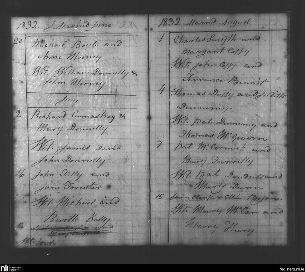 Beauparc; County of Meath; Diocese of Meath. Marriages, June 1832 to Aug. 1832