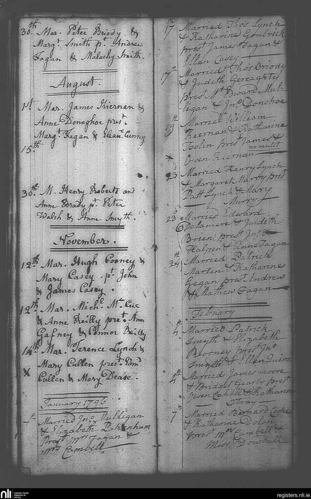 Castlepollard; County of Westmeath; Diocese of Meath. Marriages, July 1795 to Feb. 1796