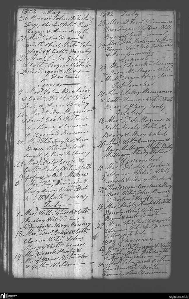 Castlepollard; County of Westmeath; Diocese of Meath. Marriages, May 1802 to Jan. 1803