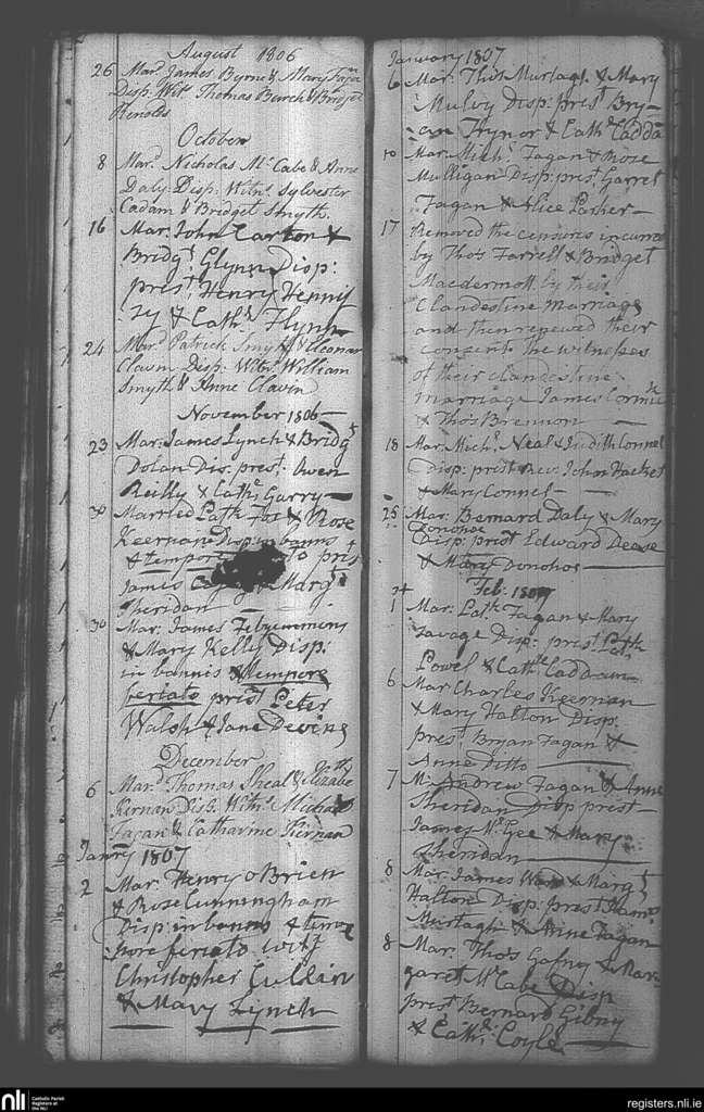 Castlepollard; County of Westmeath; Diocese of Meath. Marriages, Aug. 1806 to Feb. 1807
