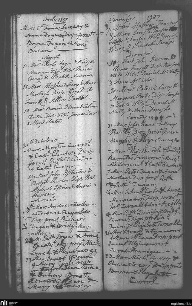 Castlepollard; County of Westmeath; Diocese of Meath. Marriages, July 1807 to Feb. 1808