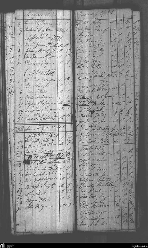 Castlepollard; County of Westmeath; Diocese of Meath. Deaths, Aug. 1820 to Mar. 1821