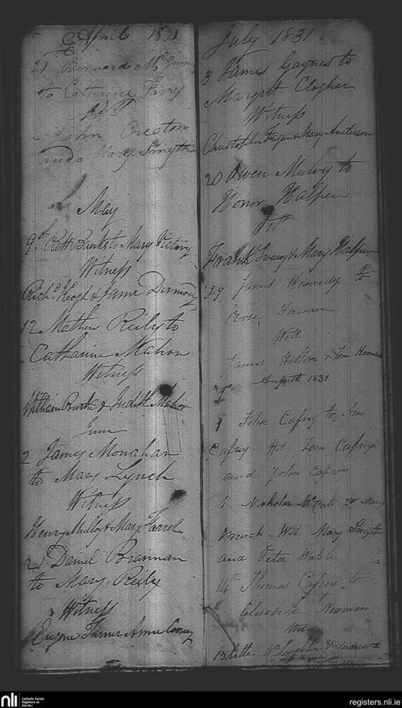 Castlepollard; County of Westmeath; Diocese of Meath. Marriages, Apr. 1831 to Aug. 1831