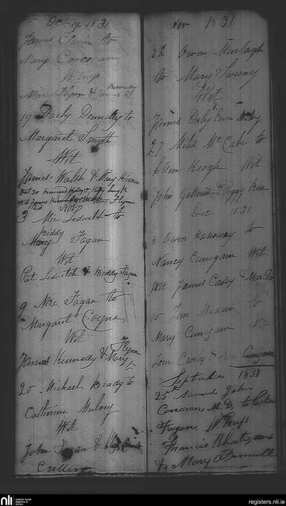 Castlepollard; County of Westmeath; Diocese of Meath. Marriages, Sep. 1831 to Dec. 1831