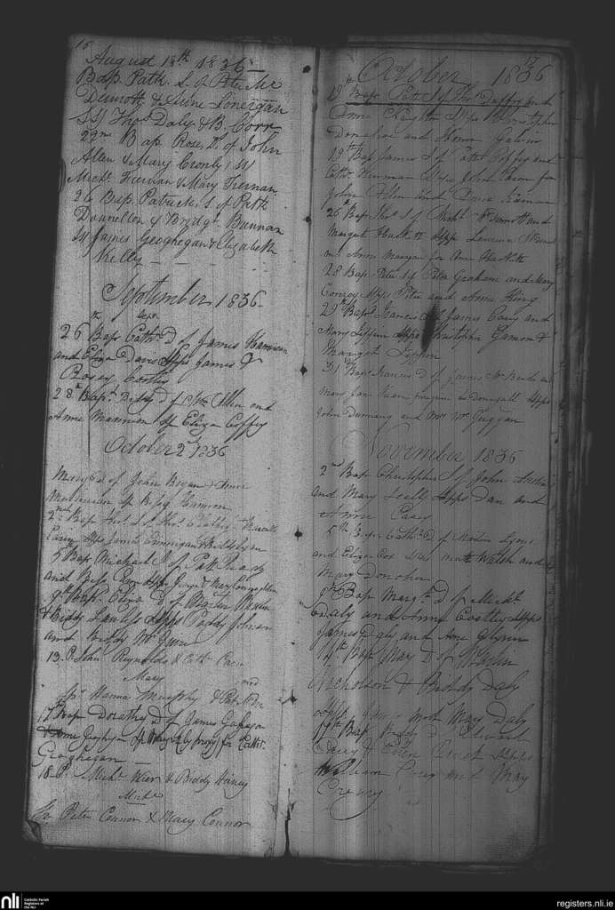Castletown-Geoghegan; County of Westmeath; Diocese of Meath. Baptisms, Aug. 1836 to Nov. 1836