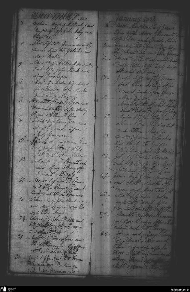 Castletown-Geoghegan; County of Westmeath; Diocese of Meath. Baptisms, Dec. 1837 to Jan. 1838