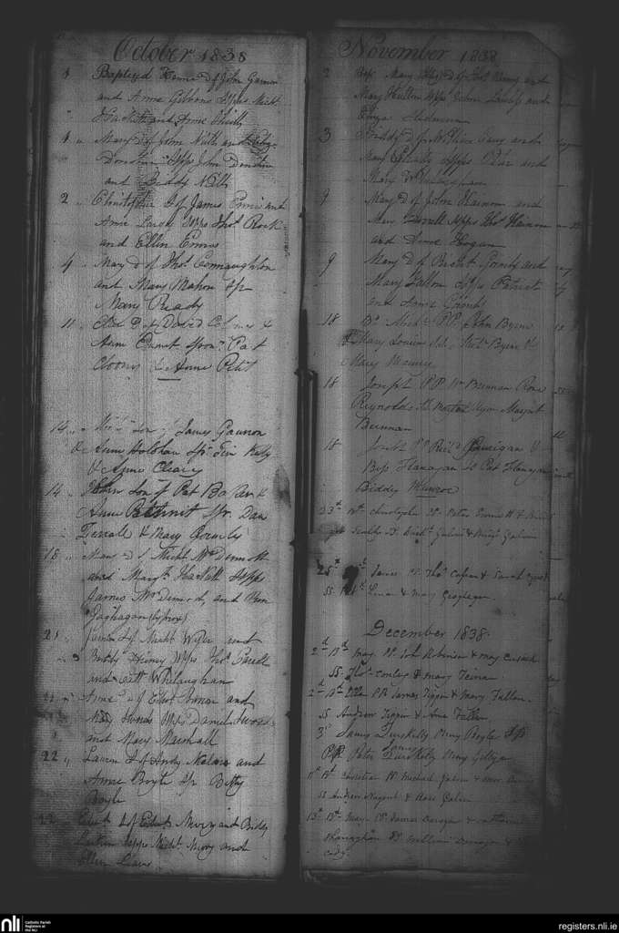 Castletown-Geoghegan; County of Westmeath; Diocese of Meath. Baptisms, Oct. 1838 to Dec. 1838