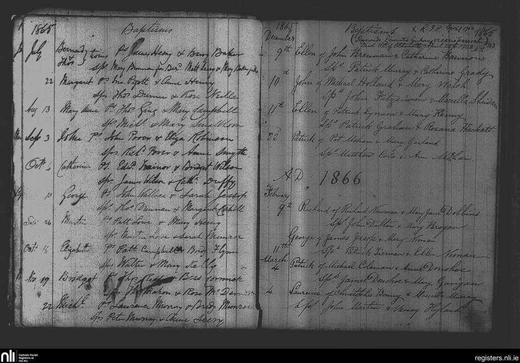 Castletown-Geoghegan; County of Westmeath; Diocese of Meath. Baptisms, July 1865 to Mar. 1866