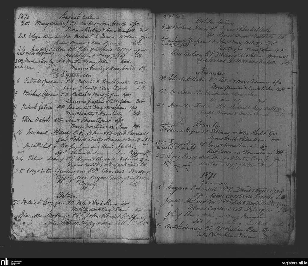 Castletown-Geoghegan; County of Westmeath; Diocese of Meath. Baptisms, Aug. 1870 to Jan. 1871