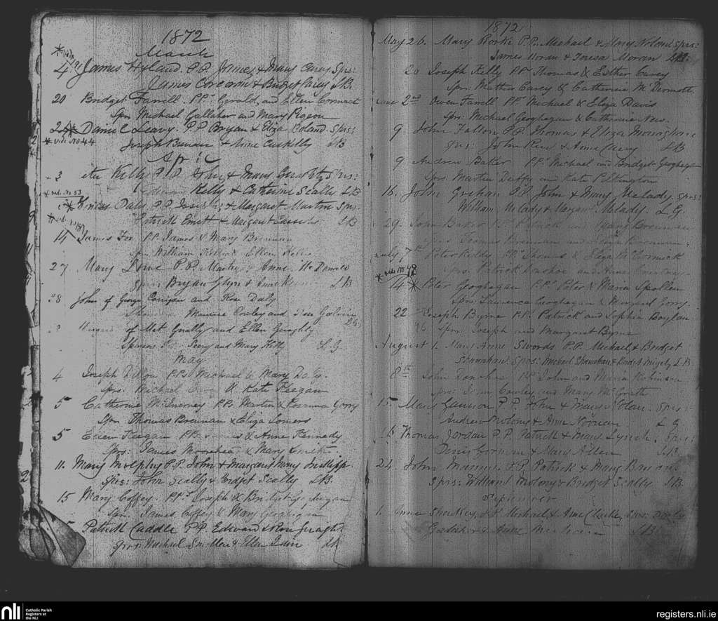 Castletown-Geoghegan; County of Westmeath; Diocese of Meath. Baptisms, Mar. 1872 to Sep. 1872