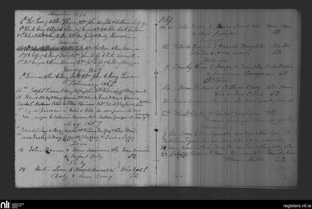 Castletown-Geoghegan; County of Westmeath; Diocese of Meath. Marriages, Nov. 1866 to Nov. 1867