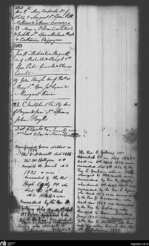 Castletown-Kilpatrick; County of Meath; Diocese of Meath. Baptisms, Dec. 1820 to Jan. 1821