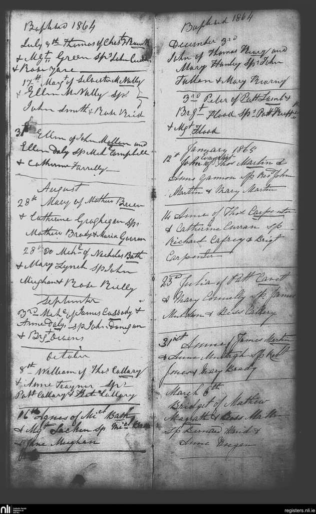 Castletown-Kilpatrick; County of Meath; Diocese of Meath. Baptisms, July 1864 to Mar. 1865