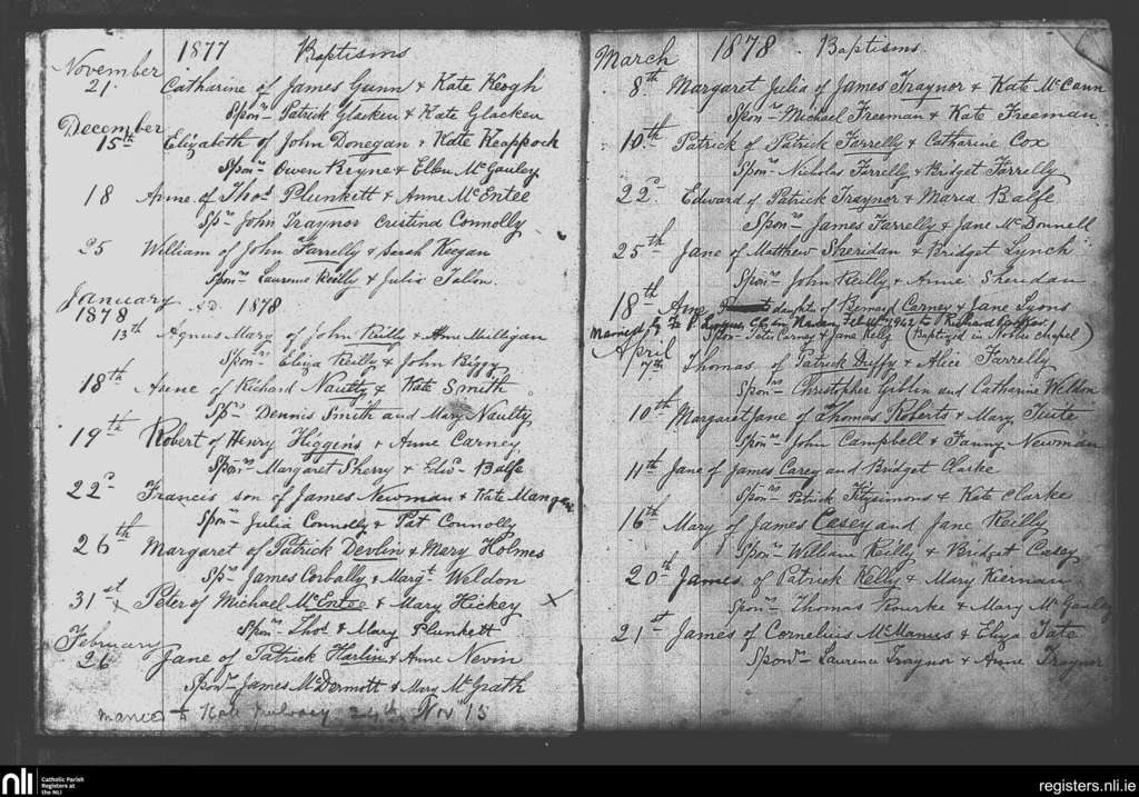 Castletown-Kilpatrick; County of Meath; Diocese of Meath. Baptisms, Nov. 1877 to Apr. 1878
