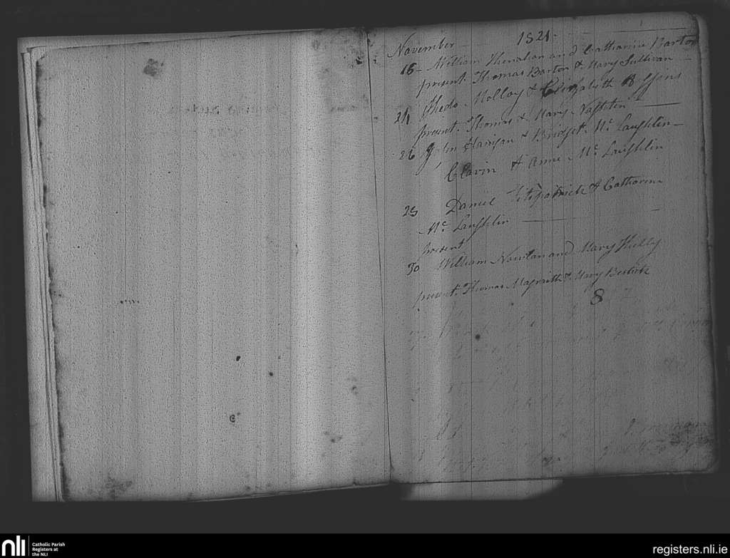 Clara and Horseleap; County of Offaly, Westmeath; Diocese of Meath. Marriages, Nov. 1821 to Jan. 1822