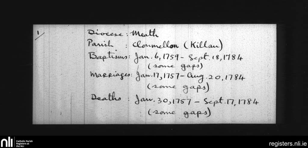Clonmellon; County of Meath, Westmeath; Diocese of Meath. Baptisms, Marriages, Deaths