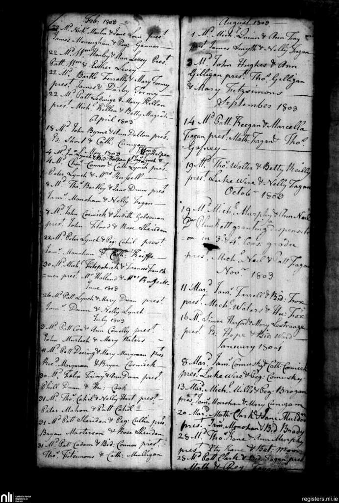Collinstown; County of Westmeath; Diocese of Meath. Marriages, Feb. 1803 to Jan. 1804