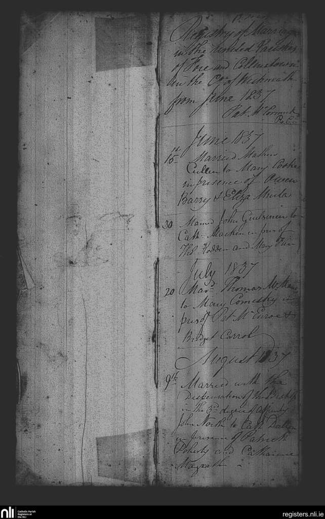 Collinstown; County of Westmeath; Diocese of Meath. Marriages, June 1837 to Aug. 1837