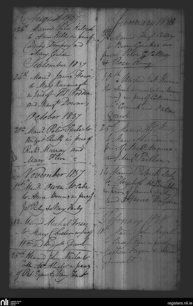 Collinstown; County of Westmeath; Diocese of Meath. Marriages, Aug. 1837 to Feb. 1838