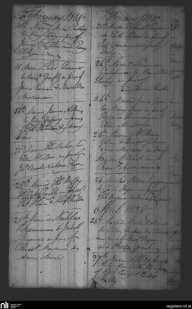 Collinstown; County of Westmeath; Diocese of Meath. Marriages, Feb. 1838 to Apr. 1838