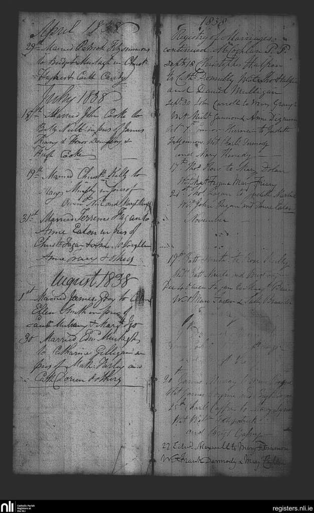 Collinstown; County of Westmeath; Diocese of Meath. Marriages, Apr. 1838 to Jan. 1839