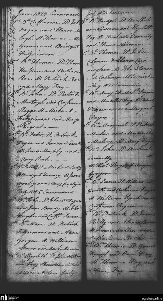 Mayne; County of Westmeath; Diocese of Meath. Baptisms, June 1825 to Aug. 1825