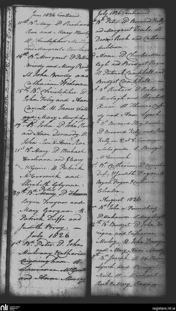Mayne; County of Westmeath; Diocese of Meath. Baptisms, June 1826 to Aug. 1826
