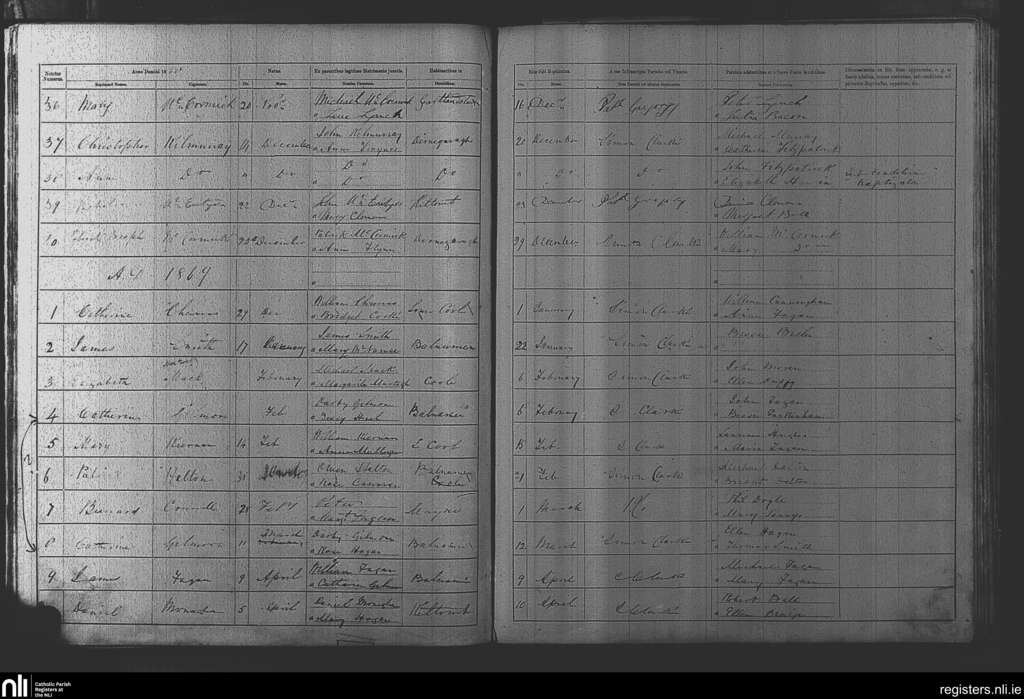 Mayne; County of Westmeath; Diocese of Meath. Baptisms, Dec. 1868 to Apr. 1869