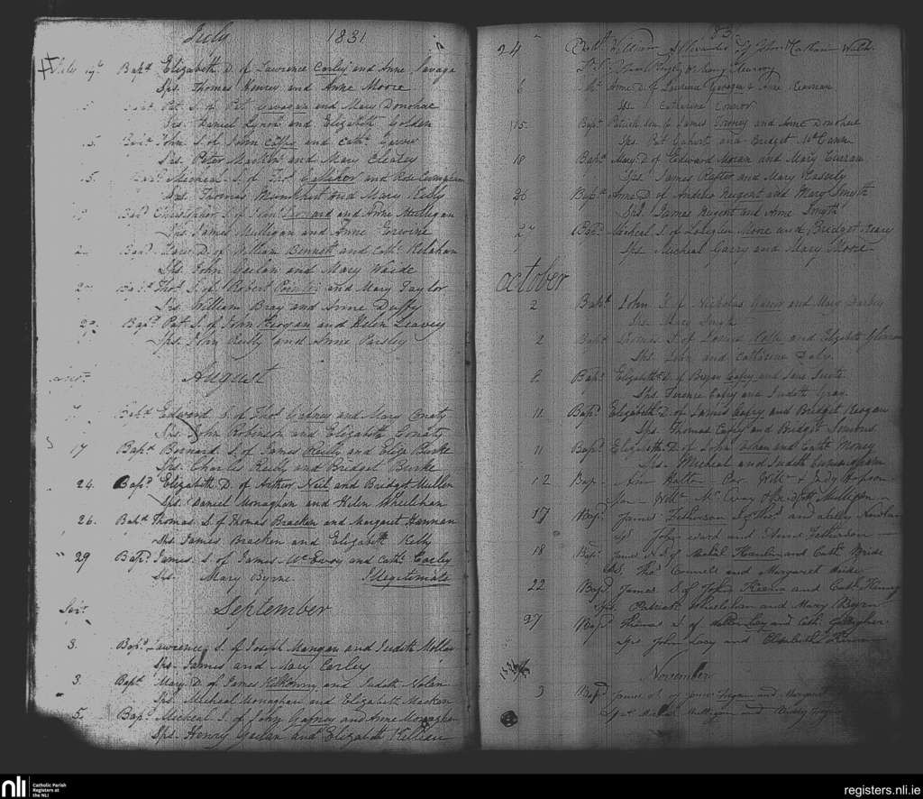 Delvin; County of Westmeath; Diocese of Meath. Baptisms, July 1831 to Nov. 1831