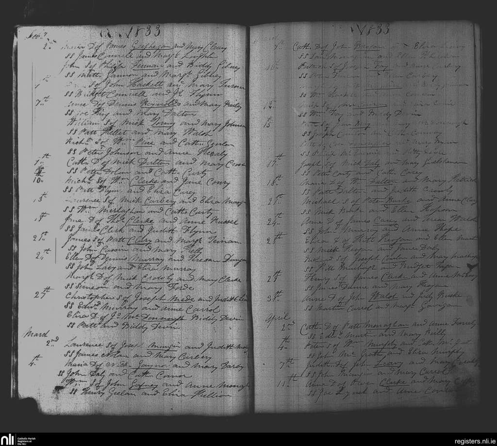 Delvin; County of Westmeath; Diocese of Meath. Baptisms, Feb. 1833 to Apr. 1833