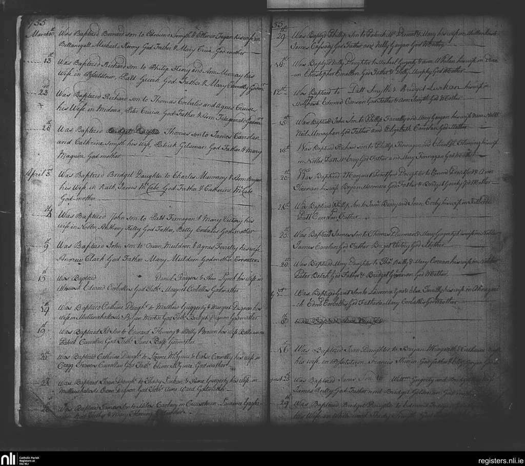 Nobber; County of Meath; Diocese of Meath. Baptisms, Mar. 1755 to Aug. 1755