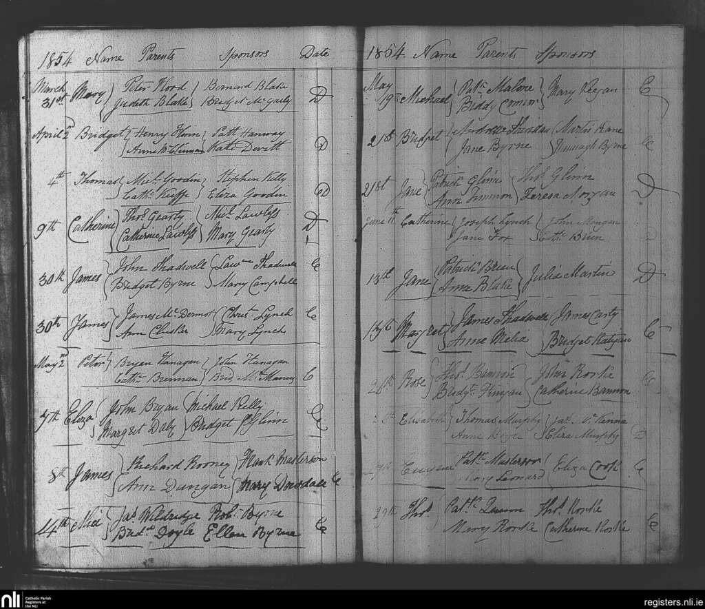 Dunshaughlin; County of Meath; Diocese of Meath. Baptisms, Mar. 1854 to June 1854