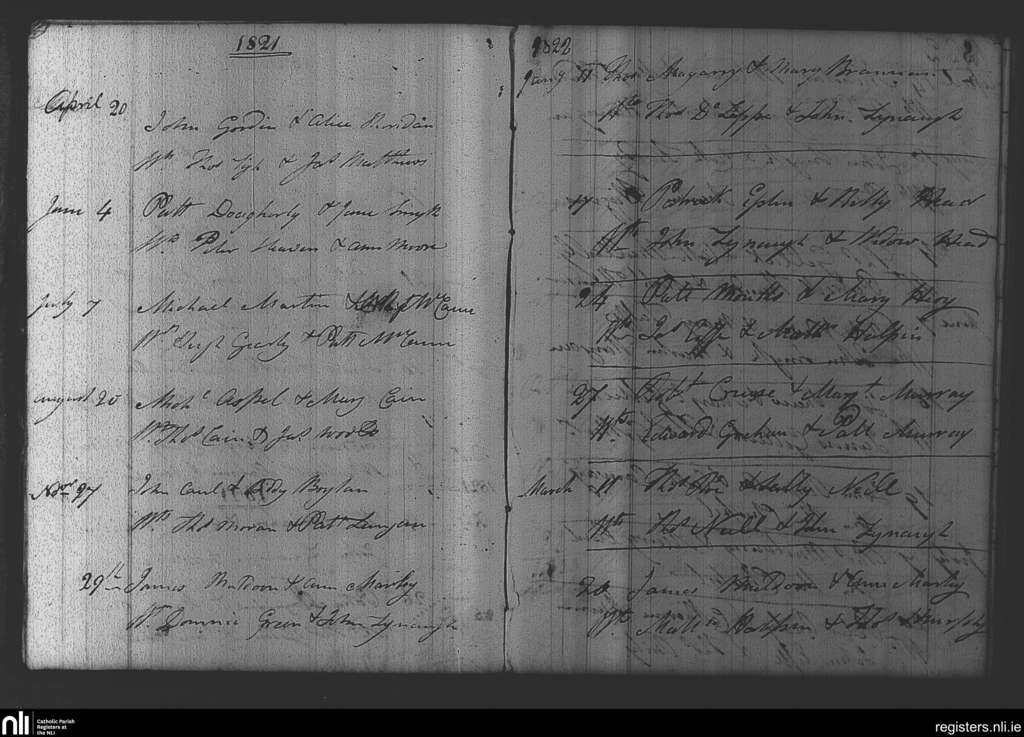Ratoath; County of Meath; Diocese of Meath. Marriages, Apr. 1821 to Mar. 1822