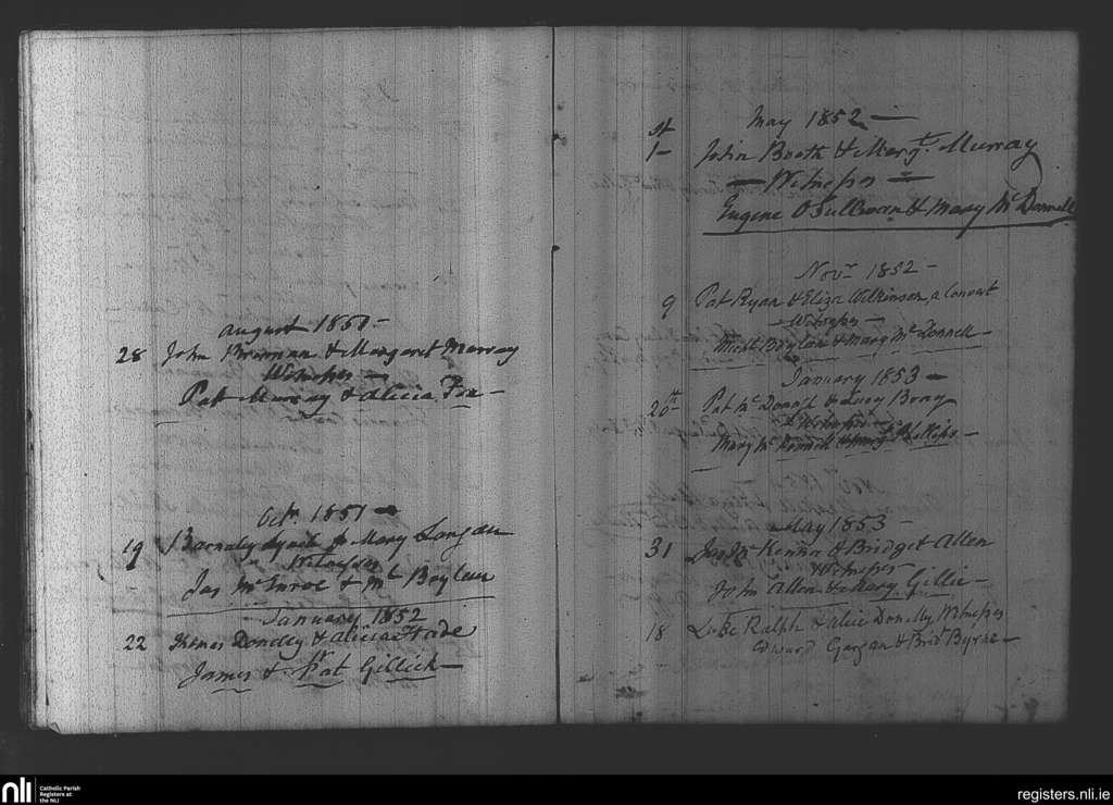 Ratoath; County of Meath; Diocese of Meath. Marriages, Aug. 1851 to May 1853