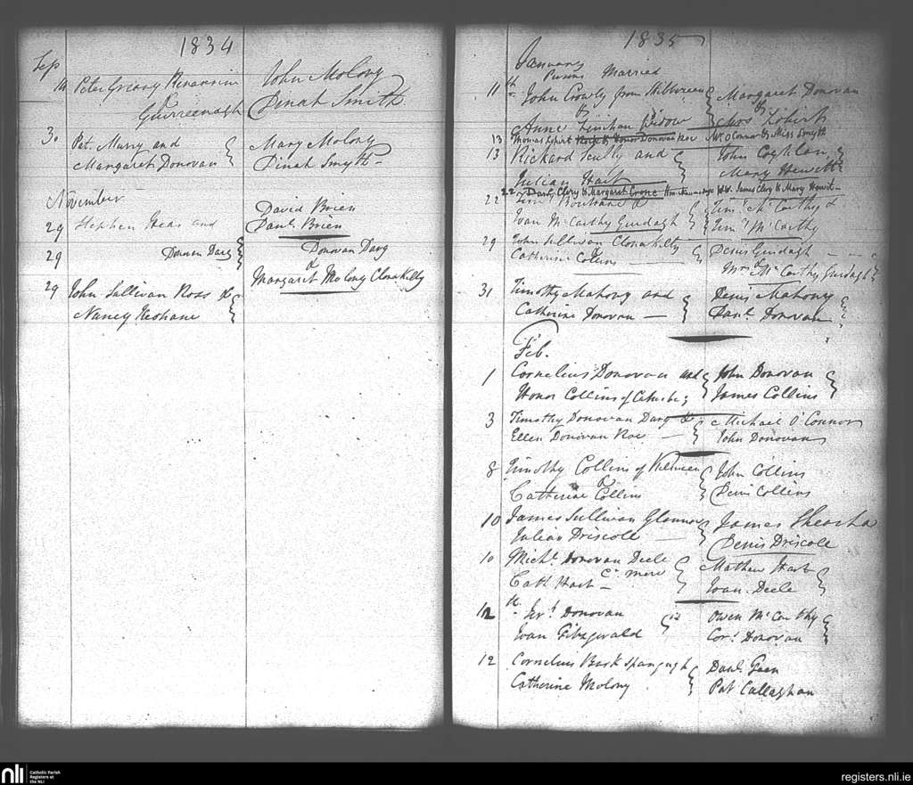 Roscarberry; County of Cork; Diocese of Cork and Ross. Marriages, Sep. 1834 to Feb. 1835