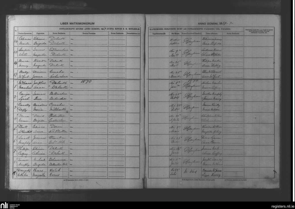Duleek; County of Meath; Diocese of Meath. Marriages, Oct. 1869 to July 1870