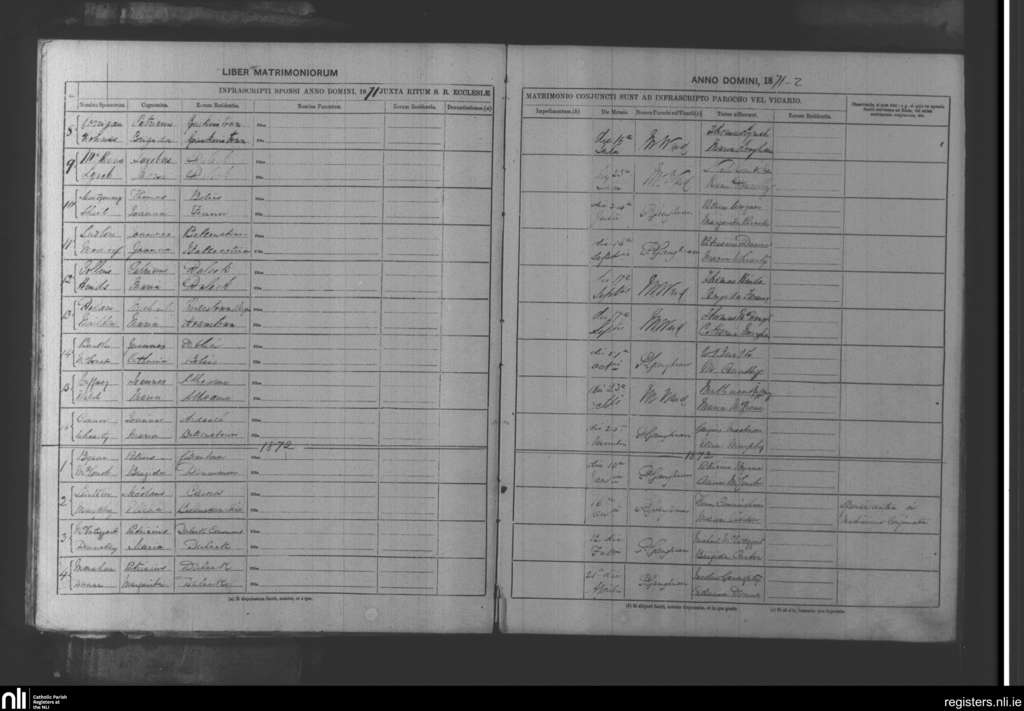 Duleek; County of Meath; Diocese of Meath. Marriages, July 1871 to Apr. 1872