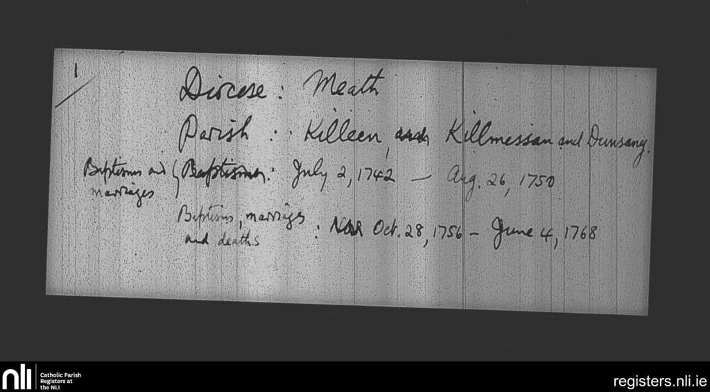 Killeen; County of Meath; Diocese of Meath. Baptisms, Marriages, Deaths