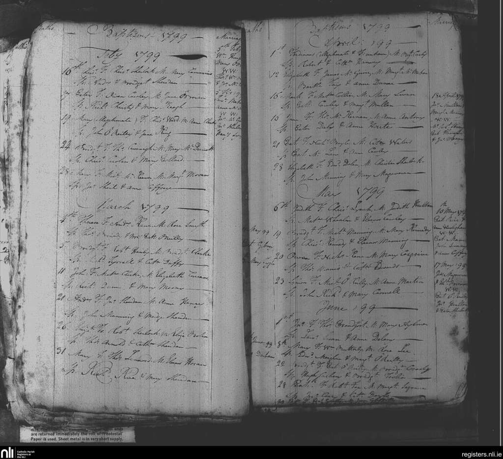 Killeen; County of Meath; Diocese of Meath. Baptisms, Marriages, Deaths, Feb. 1799 to June 1799