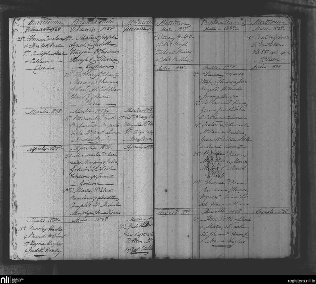 Killeen; County of Meath; Diocese of Meath. Baptisms, Marriages, Deaths, Feb. 1838 to Aug. 1838