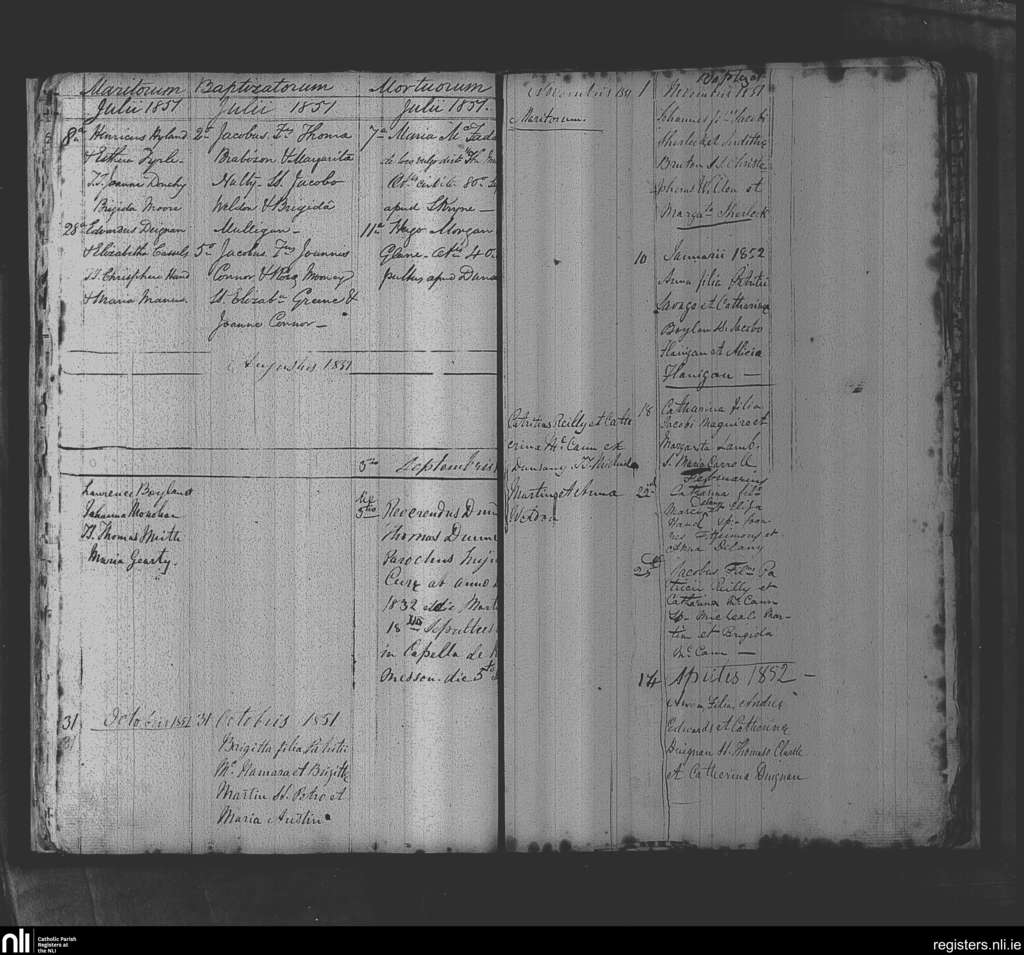 Killeen; County of Meath; Diocese of Meath. Baptisms, Marriages, Deaths, July 1851 to Aug. 1859