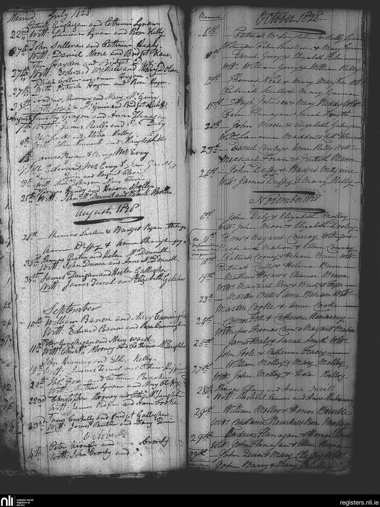 Tullamore; County of Offaly, Westmeath; Diocese of Meath. Marriages, July 1828 to Nov. 1828