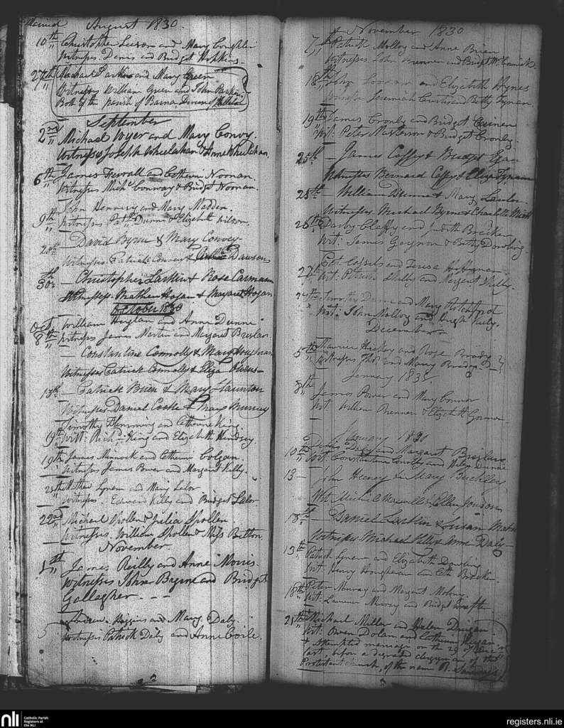 Tullamore; County of Offaly, Westmeath; Diocese of Meath. Marriages, Aug. 1830 to Jan. 1831