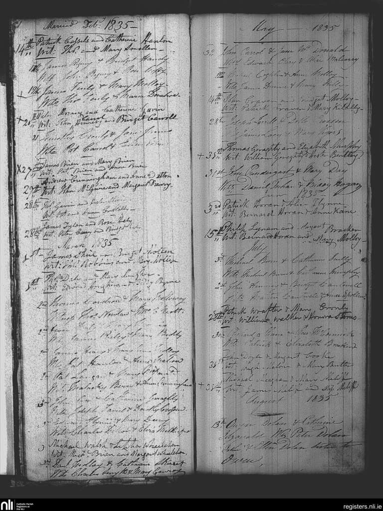Tullamore; County of Offaly, Westmeath; Diocese of Meath. Marriages, Feb. 1835 to Aug. 1835