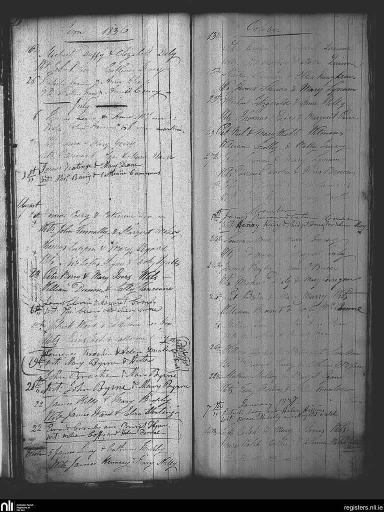 Tullamore; County of Offaly, Westmeath; Diocese of Meath. Marriages, June 1836 to Jan. 1837
